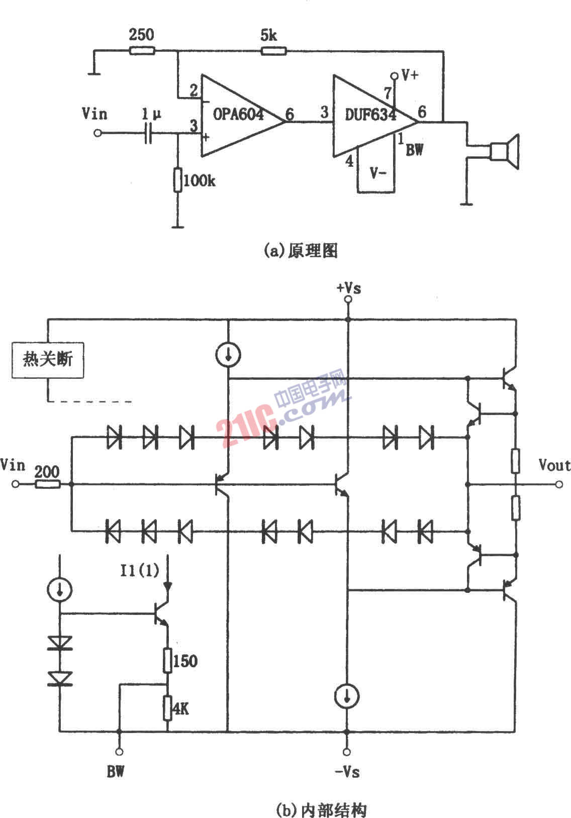 如圖所示為高性能小功率音頻功率放大電路。該電路前級采用場效應(yīng)管高保真運放OPA604,后級采用高速緩沖器BUF634,且兩級放大器之間引用電壓串聯(lián)負(fù)反饋。該電路的電壓放大倍數(shù)由反饋支路的兩個電阻(5kΩ和250Ω)來確定,其值為:l+5kΩ/250Ω≈21倍。BUF634為高速緩沖器,內(nèi)部結(jié)構(gòu)簡化電路示于圖(b)。