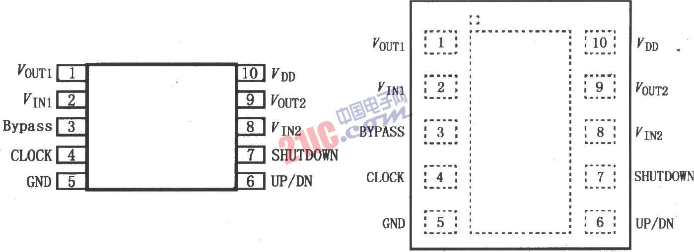 LM4811是雙聲道耳機(jī)放大器,采用5V電源供電,每個(gè)通道能夠輸出105mW連續(xù)平均功率,帶動(dòng)16Ω負(fù)載,總諧波失真及噪聲(THD+N)僅為0.1%。LM4811不需要自舉電容和緩沖器,適于低功率的便攜式系統(tǒng)、蜂窩系統(tǒng)電話以及MP3、CD、DVD播放器等。LM4811采用二線接口控制數(shù)字音量,設(shè)置放大器增益范圍為-33~+12dB,以16級(jí)離散步長(zhǎng)控制。LM4811有一個(gè)外部控制端,產(chǎn)生有效高電平關(guān)斷模式,使之在微功耗下工作,還有一個(gè)內(nèi)部熱關(guān)斷保護(hù)機(jī)構(gòu)。LM4811的引腳排列如圖所示。