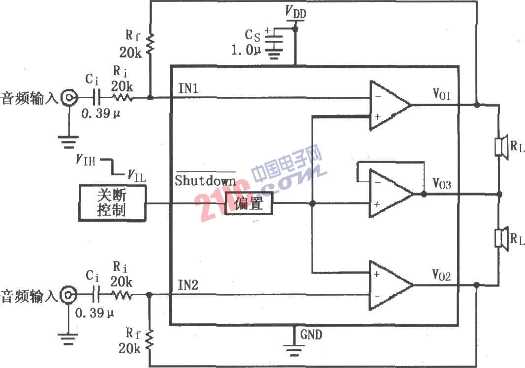 如圖所示為LM4910用于雙聲道放大器的典型電路。左、右聲道音頻信號分別輸入LM4910(MSOP/SO封裝)的1、2腳,經(jīng)過內(nèi)部放大器放大后分別由8、7、6腳輸出,直接加到各自聲道的揚聲器上。放大器增益Av=-Rf/Ri,最大功耗由PDMAX=4VDD2/π2RL。輸入端外接電阻和電容分別決定輸入-3dB帶寬,取 Ci≥1/(2π×20kΩ×20Hz),采用約 0.39μF電容。LM4910的3腳外接關(guān)斷控制,當3腳接VDD(高電平)時允許工作,接地(低電平)時禁止工作。