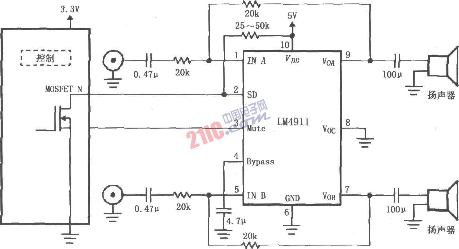 如圖所示為LM4911的不同電源導(dǎo)通時(shí)間推薦電路。該電路采用一個(gè)控制器,利用控制器內(nèi)的MOSFET管對(duì)LM4911關(guān)斷控制(SD)端進(jìn)行控制,以達(dá)到放大器導(dǎo)通時(shí)間的調(diào)控。