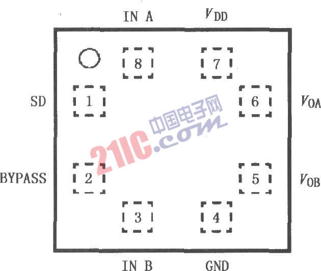 LM4915是偽差動音頻功率放大器,主要用于要求苛刻的單聲道耳機,如移動電話和其他便攜式音頻設(shè)備。LM4915采用3V電源供電,能夠輸出90mW連續(xù)平均功率,帶動32Ω BTL負(fù)載。LM4915有一個低功耗關(guān)斷模式,只需驅(qū)動控制端邏輯低電平有效。LM4915含有一個內(nèi)部熱關(guān)斷保護(hù)機構(gòu),包含了改進(jìn)型“喀-撲”聲消除電路,其內(nèi)部固定增益設(shè)置為6dB,其引腳排列如圖所示。