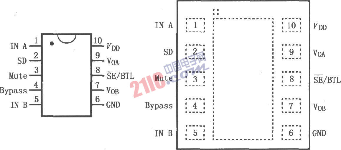 LM4916是具有兩個(gè)單聲道差動(dòng)輸出音頻功率放大器(電橋或BTL負(fù)載)和單端(SE)立體聲耳機(jī)放大器,主要用于移動(dòng)電話和其他便攜式音頻設(shè)備。LM4916采用1.5V電源供電,單聲道BTL模式能夠輸出85mW連續(xù)平均功率帶動(dòng)8Ω負(fù)載,單端(SE)立體聲耳機(jī)模式每個(gè)通道能夠輸出14mW連續(xù)平均功率帶動(dòng)16Ω負(fù)載。LM4916采用MM和LLP封裝,使用者可以得益于其小尺寸,在PCB板上所占最小空間而得到最大輸出功率。LM4916可減小轉(zhuǎn)換開(kāi)關(guān)通斷瞬間噪聲,有一個(gè)外部控制、低電平有效的微功耗關(guān)斷模式和一個(gè)內(nèi)部熱關(guān)斷保護(hù)機(jī)構(gòu)。LM4916的引腳排列如圖所示。