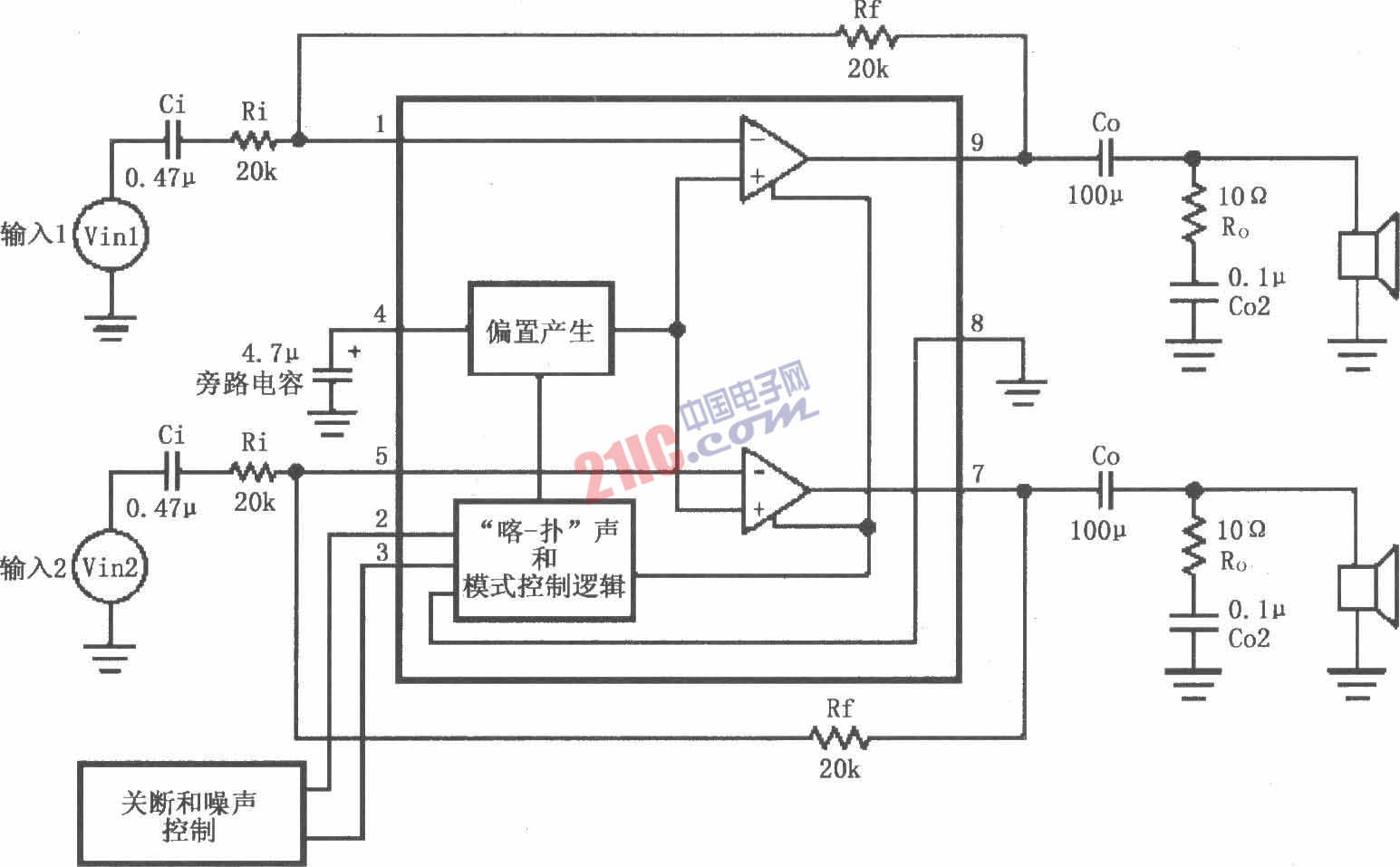 如圖所示圖中為LM4916用于雙聲道放大器的典型電路。左、右聲道音頻信號(hào)分別輸入LM4916的1、5腳,經(jīng)過(guò)內(nèi)部放大器放大后分別由9、7腳輸出,經(jīng)過(guò)耦合電容Co加到各自聲道的揚(yáng)聲器上。LM4916的2腳外接關(guān)斷控制,當(dāng)2腳接VDD時(shí)允許工作;接低電平時(shí)禁止工作,降低芯片功耗。LM4916的3腳為靜噪控制,當(dāng)3腳接低電平時(shí)為靜噪模式,禁止芯片工作,以消除開(kāi)關(guān)轉(zhuǎn)換引起的“喀-撲”聲;接高電平時(shí)允許工作。