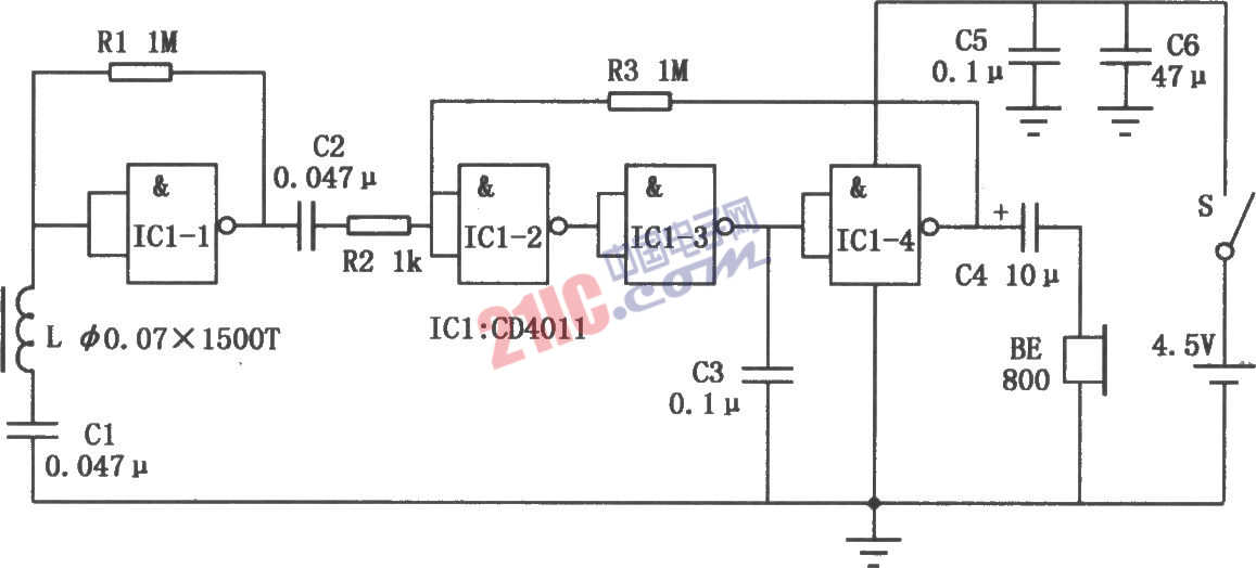 感應(yīng)式無線耳機(jī)廣泛用于電化教學(xué)、家庭電視和音響的音頻信號(hào)無線接收,使用時(shí)既可消除耳機(jī)接線帶來的不便,又可避免對(duì)他人休息、學(xué)習(xí)的干擾。本電路主要由四與非門集成電路CD4011及少量外圍元件組裝而成,電路簡(jiǎn)單、音質(zhì)優(yōu)良、不用調(diào)試、一裝即成。