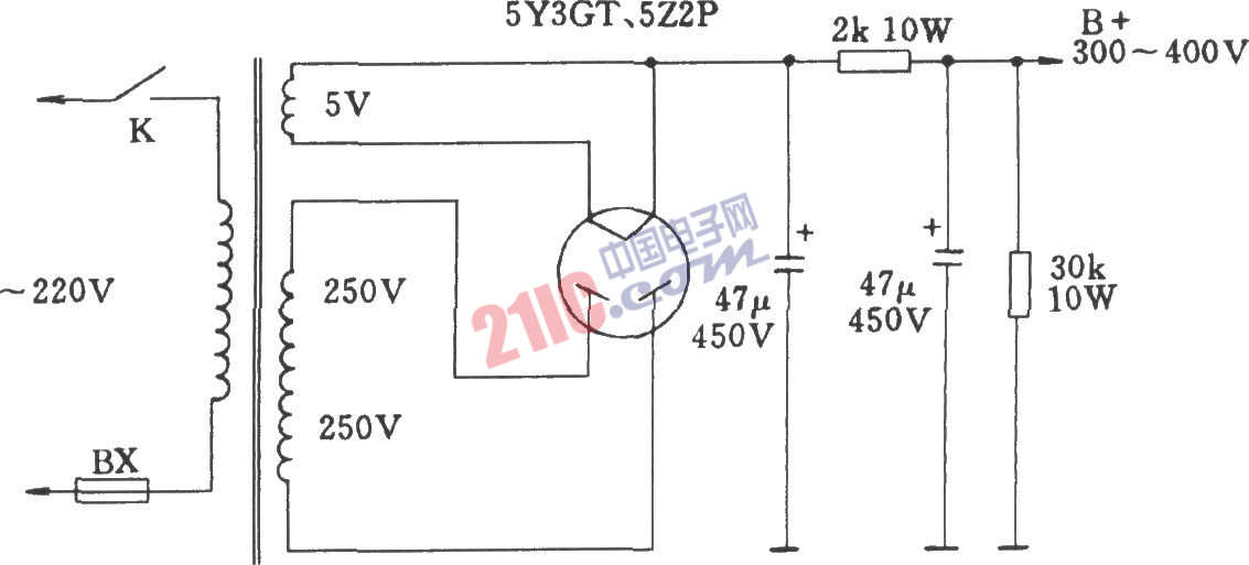 直熱式整流電子管全波整流及濾波電路
