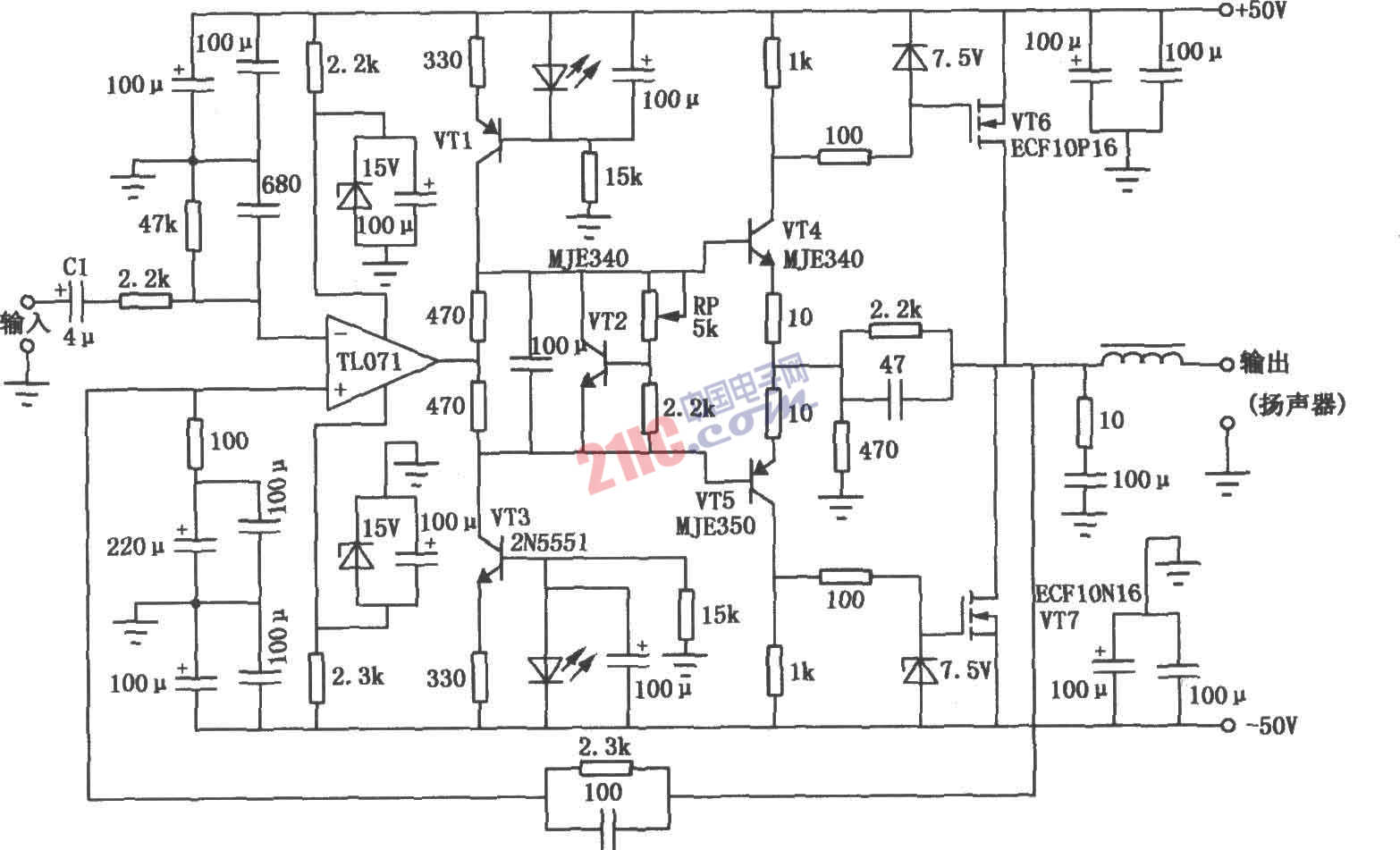 MOSFET功放電路主要應用于大功率AV電路中。如圖所示為100W的MOSFET功放電路。該電路的輸入級采用JEFT輸入型運放TL071,其輸入阻抗大、轉換速率高。VTl和VT3為運放TL071的互補恒流源負載。VT4和VT5組成典型的推動級,其線性好、響應快。輸出級VT6和VT7采用MOSFET管,其音色優(yōu)美,放大倍數(shù)約為5。C1選用金屬化聚丙烯電容,以避免產生失真。該放大器的技術指標為;全功率時的頻響為15Hz~125kHz,轉換速率為25V/μs,輸出噪聲-95dB,阻尼系數(shù)大于400(8Ω負載)。