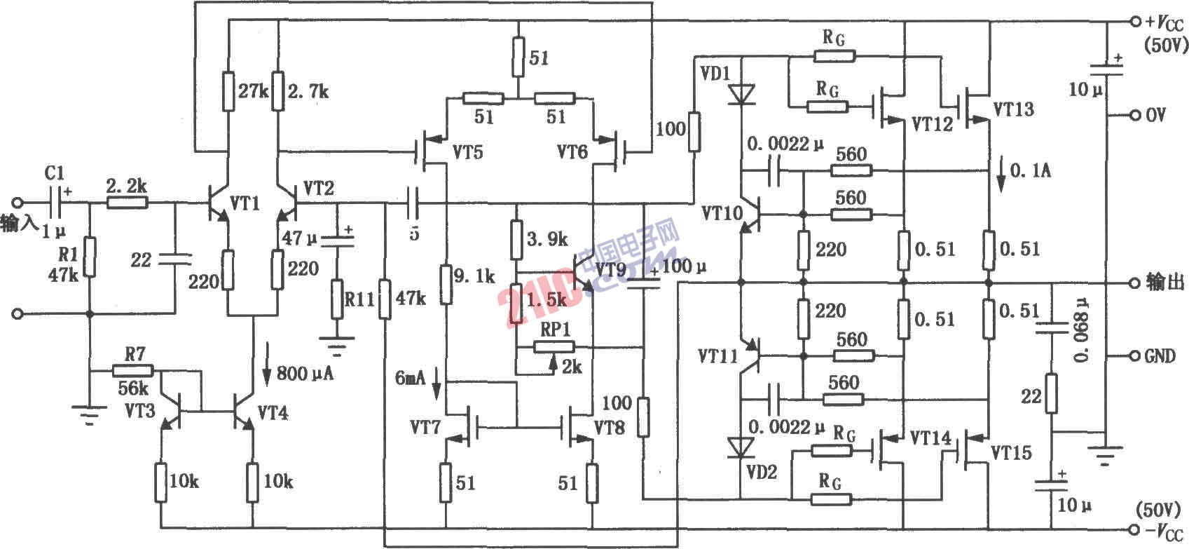 如圖所示電路是采用功率MOSFET管構(gòu)成的功率放大器電路。電路中差動第二級采用2SJ77***率MOSFET,電流鏡像電路采用2SK214。其工作電流為6mA,但電源電壓較高(為±50V),晶體管會發(fā)熱,因此要接人小型散熱器。