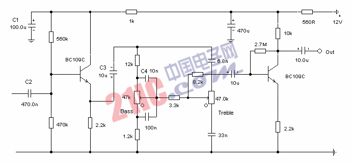 Based on the classic Baxendall tone control circuit, this provides a maximum cut and boost of around 10dB at 10K and 50Hz. As the controls are passive, the last transistor provides a slight boost. The output is designed to feed an amplifier with input impedance of 10k to 250k.
