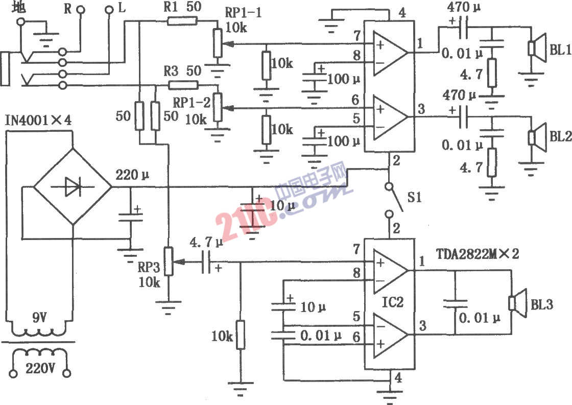 小型床頭聽音系統(tǒng)的電路如圖所示。本音響系統(tǒng)采用兩只TDA2822M集成電路,具有體積小、組裝簡(jiǎn)單、放音效果好等優(yōu)點(diǎn),尤其是加強(qiáng)了低音效果,非常適合住集體宿舍的“發(fā)燒友”一族制作。IC1、IC2均為立體聲功放集成電路TDA2822M,其中IC1組成雙聲道功率放大電路,音源信號(hào)經(jīng)電阻R1、R3及雙聯(lián)電位器RP1-1、RPl-2送入ICl進(jìn)行功率放大,放大后的音頻信號(hào)推動(dòng)揚(yáng)聲器BL1、BL2工作。IC2以BTL電路形式構(gòu)成低音效果功放,使用時(shí)由開關(guān)Sl控制其是否工作。由于BTL電路功耗較大,安裝時(shí)IC2應(yīng)加上適當(dāng)?shù)纳崞?。此外,由于低音效果功放沒有加裝低通濾波器,在使用過程中,應(yīng)盡量利用音源機(jī)的音調(diào)控制電路或采用小型低音音箱以加強(qiáng)低音效果。