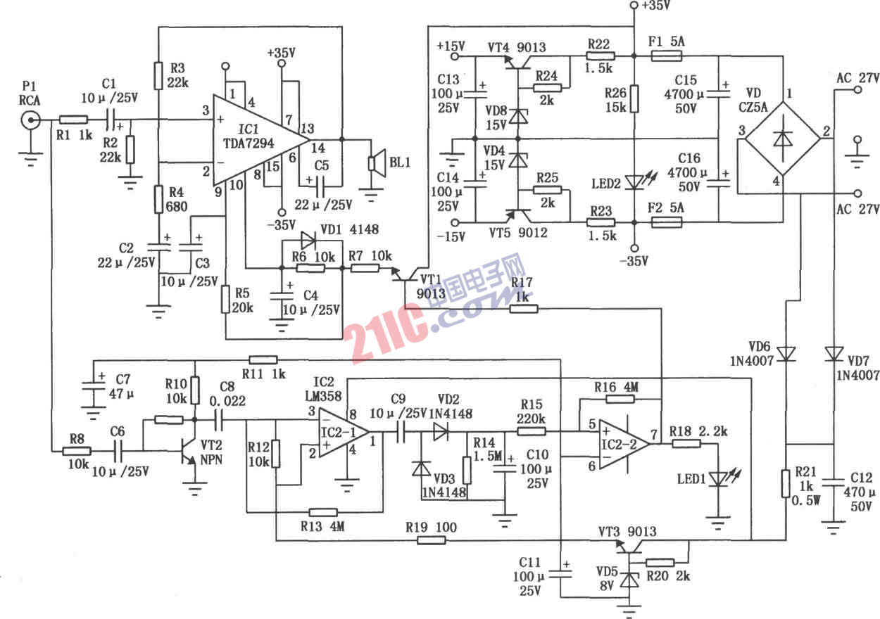 本電路是對使用集成電路TDA7294的音響電路進(jìn)行改進(jìn)的。TDA729410腳具有靜音功能,當(dāng)外部提供一直流高電平時(shí),集成塊處于工作狀態(tài);低電平作用時(shí),集成塊則處于截止?fàn)顟B(tài),此時(shí)電路耗電微小,IC1 14腳無輸出,即“待機(jī)”形式。一般的電路都是給10腳提供高電平使其處于導(dǎo)通狀態(tài),其實(shí)開發(fā)此腳功能可滿足某些特殊的工作要求。本電路就是據(jù)此使有源低音炮功放增加待機(jī)功能,其電路工作可靠、反應(yīng)靈敏。