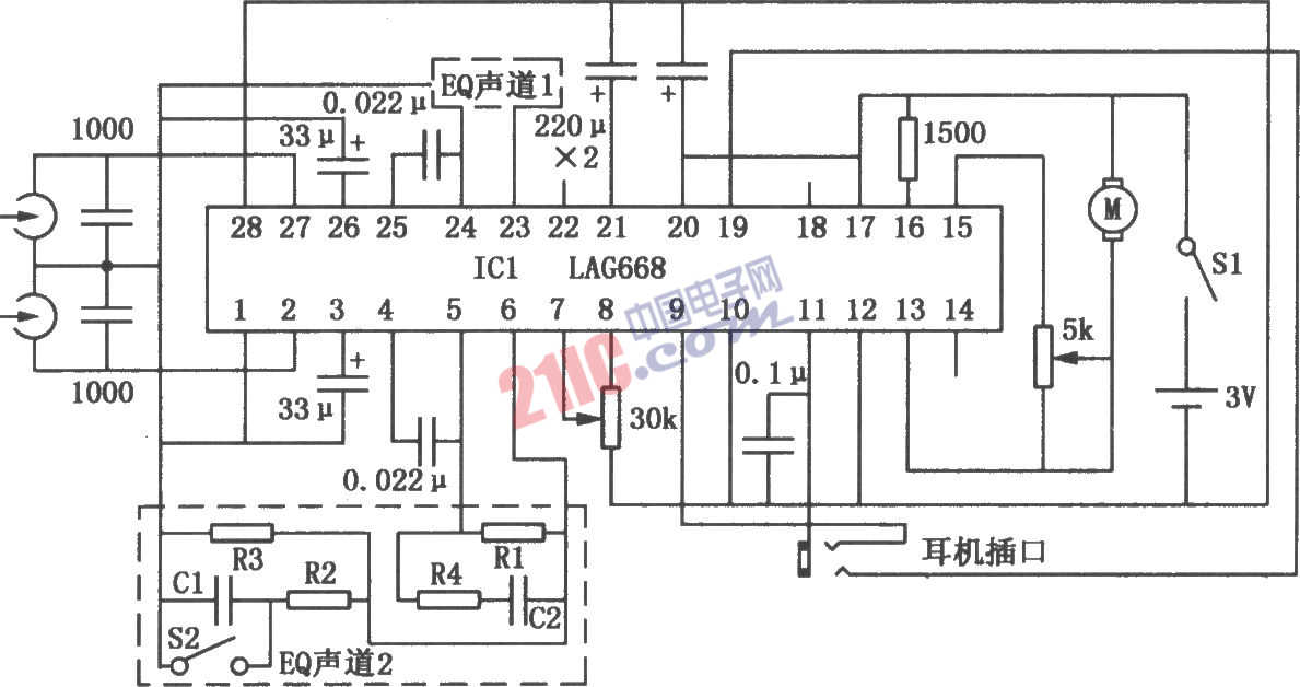LAG665和LAG668都是單片放音機(jī)IC,LAG668是LAG665的改進(jìn)型,二者內(nèi)部電路結(jié)構(gòu)大致相同。對(duì)于偏愛低音的愛好者,可用LAG668替換原機(jī)LAG665,同時(shí)對(duì)相應(yīng)的外接電路加以改動(dòng),以實(shí)現(xiàn)低音效果的提升。低頻提升的措施通常是衰減高、中頻。高、中頻衰減后,信號(hào)同時(shí)減弱,對(duì)后級(jí)的激勵(lì)減小,影響音頻靈敏度和動(dòng)態(tài)效果,音量降低,不能達(dá)到額定的功率輸出。其補(bǔ)救措施一是提高前級(jí)的電壓增益;二是增加一級(jí)電壓放大;三是提高后級(jí)的輸入阻抗,以提高后級(jí)的輸入靈敏度,用較小的激勵(lì)就能滿足后級(jí)需要;四是提高功放的增益。LAG668采用了后兩種措施,一是將后級(jí)(衰減器)的輸入阻抗由LAG665的20k12提高到200kt2;二是將功放的電壓增益由LAG665的28dB提高到38dB。如圖是隨身聽低音提升電路,聲道1的音調(diào)網(wǎng)絡(luò)與聲道2相同。