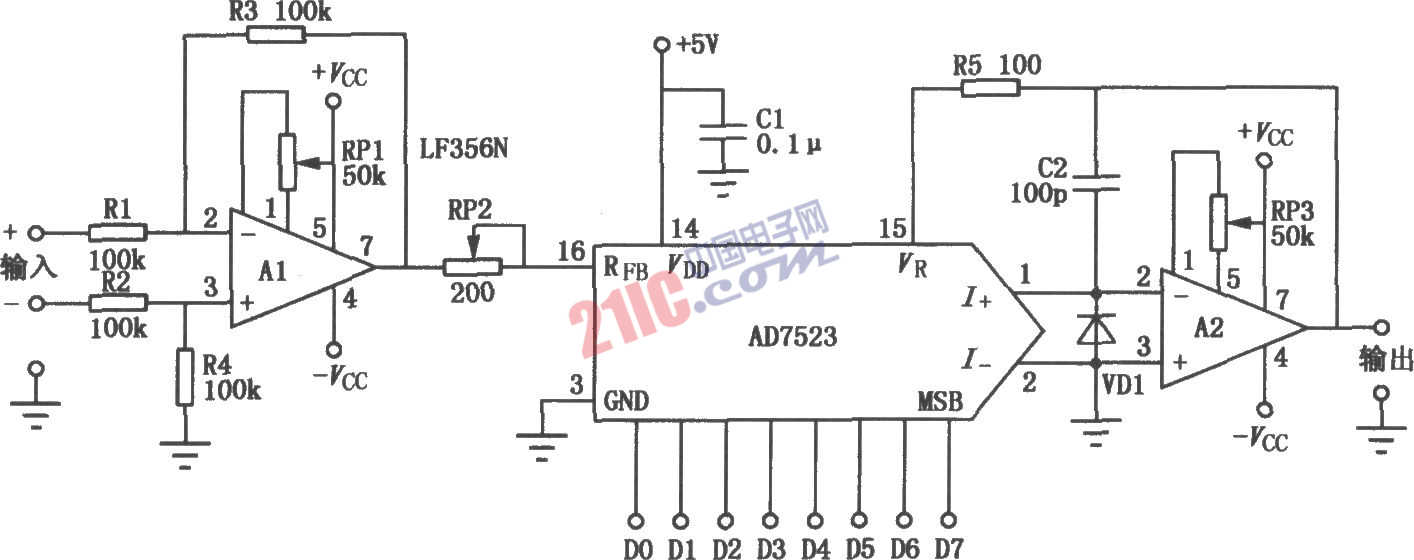 如圖所示是采用A/D轉(zhuǎn)換器AD7523構(gòu)成的可編程增益放大器。電路由8位數(shù)據(jù)來控制增益,使增益在1~256范圍內(nèi)變化,由于從D7(最高位)開始依次只有1位電平為高,所以能以6dB為步長(zhǎng),從6dB變到42dB。AD7523片內(nèi)有模擬開關(guān)和R-2R梯形網(wǎng)絡(luò),額定阻值為5~20kΩ,中心值為10kΩ。若從RFB端直接輸入信號(hào),側(cè)輸入電阻很低,所以在前面接入緩沖放大器Al,起到倒相的作用。若從Al的同相端輸入,則可得到同相信號(hào)。對(duì)于可變?cè)鲆娣糯笃鳎粼鲆娓?,則失調(diào)電壓大,因此需要對(duì)運(yùn)放進(jìn)行準(zhǔn)確調(diào)零,尤其要注意Al的輸出。在RFB端串聯(lián)電位器RP2進(jìn)行增益的校準(zhǔn)。運(yùn)放A2由于負(fù)反饋可變,設(shè)定增益越大,閉環(huán)頻率響應(yīng)越壞。需要選用增益可變范圍窄或開環(huán)頻率特性好的運(yùn)放。對(duì)于小功率或精密運(yùn)放,因?yàn)闋奚私涣魈匦?,所以?dāng)輸入幾千赫茲以上的信號(hào)時(shí)應(yīng)予以注意。
