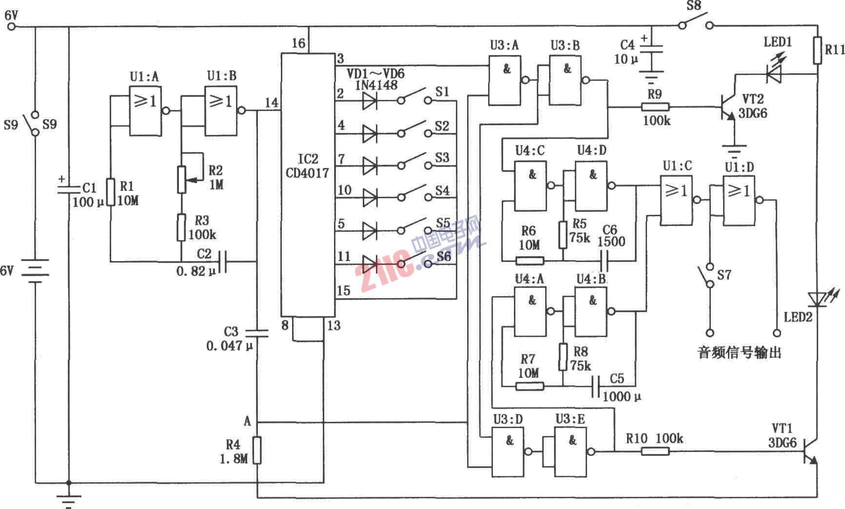 加重低音節(jié)拍器可以加重每一個節(jié)拍,也可用于加重第2、第3、第4、第6及第9個節(jié)拍的低音強(qiáng) 度。由于該節(jié)拍器選用了紅、綠兩種不同顏色的發(fā)光二極管,使其具有了光顯示功能,紅色發(fā)光二極管用作加重低音節(jié)拍的燈光指示,而非加重節(jié)拍則由綠色發(fā)光二極管指示,因此用戶可以很容易地辨別出哪一個是加重低音節(jié)拍。加重低音節(jié)拍器的電路圖如圖所示。整個電路由4塊CMOS數(shù)字集成電路組成。 |