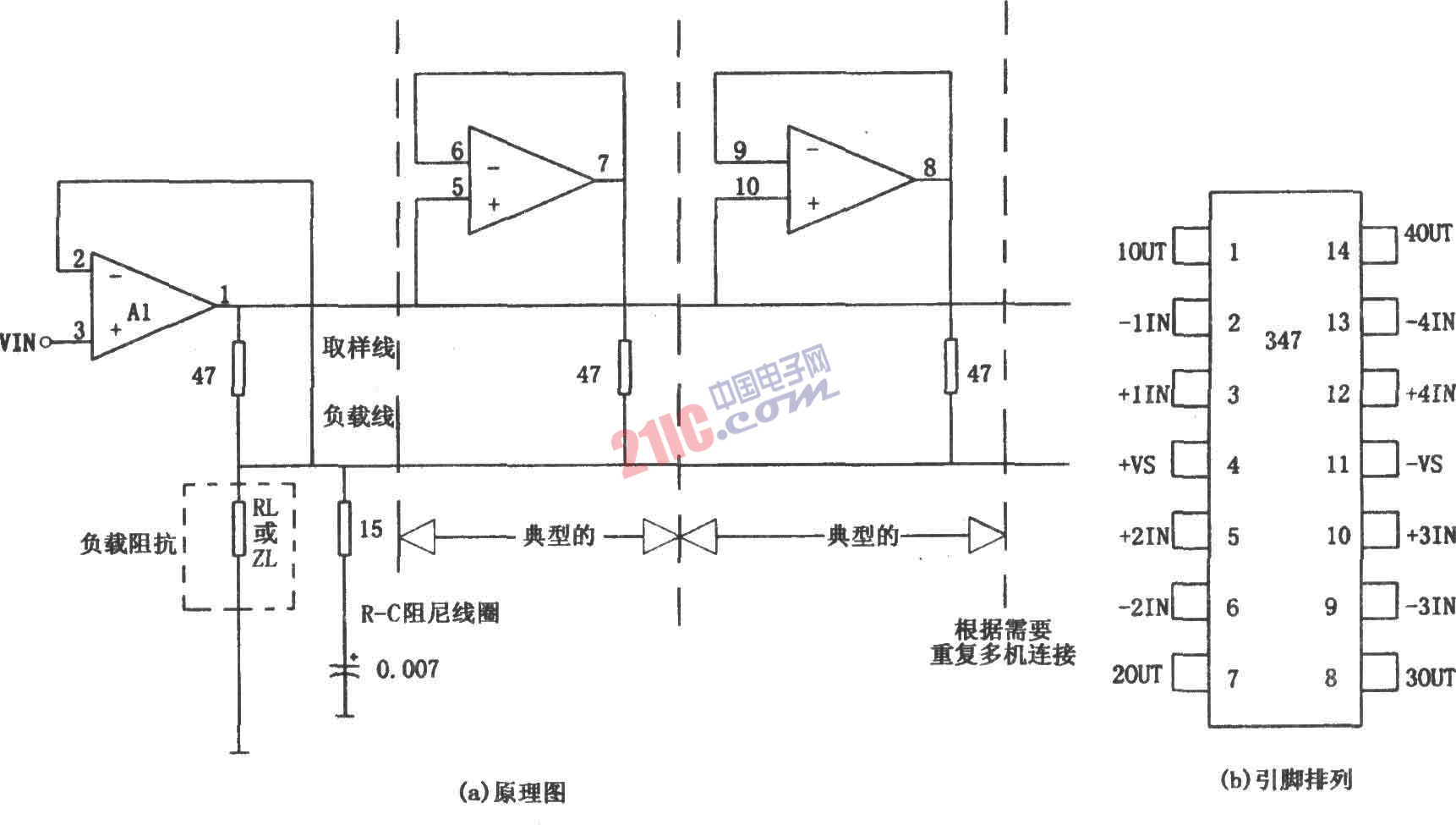 把兩個(gè)或更多個(gè)放大器的輸出組合起來(lái)可構(gòu)成復(fù)合并聯(lián)緩沖器,如圖所示。電路的輸出電流是多個(gè)并聯(lián)運(yùn)放的輸出電流之和。A1、A2可選用通用集成四運(yùn)放LF347(或LM324、OP496、TL35074等)。