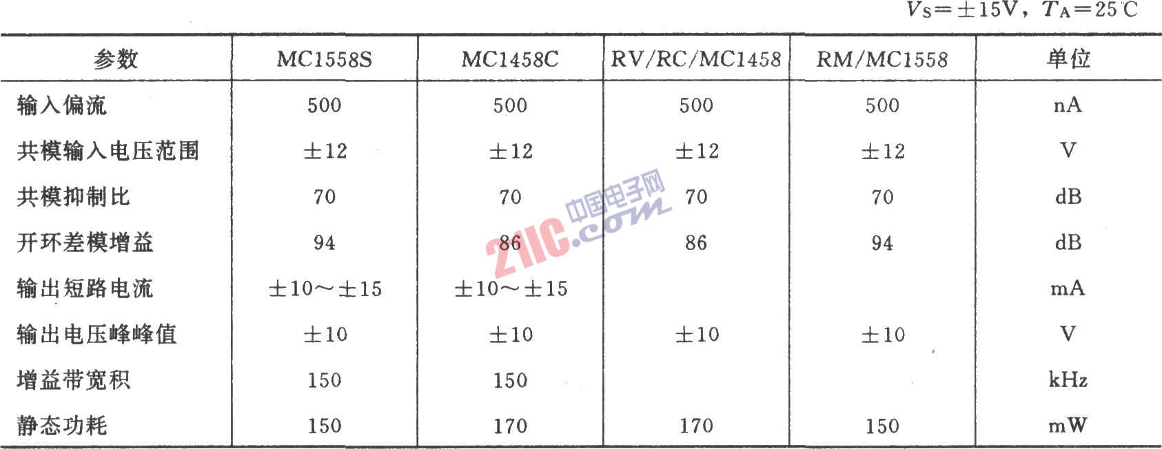 雙運(yùn)放1458(1558)的主要參數(shù)(典型值):