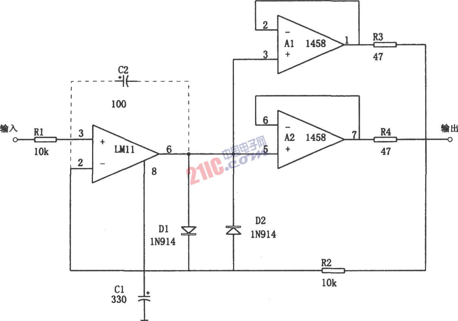 如圖所示為精密復(fù)合緩沖器電路。電路中的前級(jí)由精密運(yùn)放LM11組成電壓跟隨器,后級(jí)的并聯(lián)部分采用通用雙運(yùn)放MC1458(或MC1558雙運(yùn)放)。輸入信號(hào)通過10kΩ的R1加到前級(jí)的同相輸入端(引腳3),其引腳8外接330pF的補(bǔ)償電容C1,以實(shí)現(xiàn)過補(bǔ)償,其目的是提高輸出并聯(lián)緩沖級(jí)的帶寬和壓擺率,有時(shí)在前級(jí)的輸出端(引腳6)和反相輸入端(引腳2)之間外接100pF的電容C2,用以提高電路的穩(wěn)定性。前級(jí)的輸出端和反相輸入端之間外接兩個(gè)二極管D1和D2(型號(hào)為1N914),其作用是對LM11過驅(qū)動(dòng)時(shí)進(jìn)行鉗位,用以減小阻塞傾向,并可使恢復(fù)時(shí)間減到最小。適合于作為輸入級(jí)的其他運(yùn)放可選用的能夠過補(bǔ)償?shù)钠骷邕\(yùn)放308、312等。