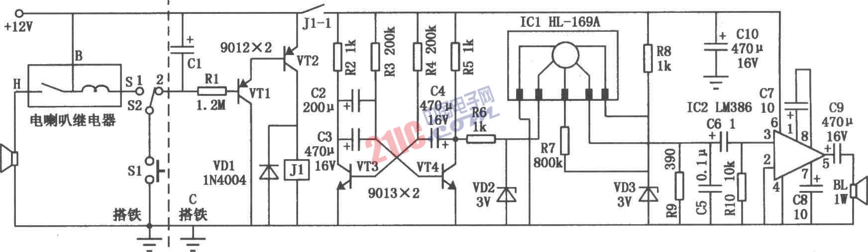 如圖所示為汽車語音喇叭的電路。圖中虛線左邊為原車電喇叭電路圖,Sl為方向盤上的電喇叭按鈕開關(guān)。S2為新增加的單刀雙擲開關(guān),用于原車電喇叭和語音喇叭之間的切換。當(dāng)開關(guān)S2置于“2”時,按下開關(guān)Sl,電容Cl被充電,三極管VTl、VT2導(dǎo)通,繼電器Jl吸合,其常開接點J1-1閉合并保持15秒鐘向電路供電。ICl為專用語音集成電路HL-169A,由于其工作時間為2.8秒,所以用三極管VT3、VT4組成自激多諧振蕩器,每3秒鐘輸出一次高電平作為觸發(fā)信號,使ICl每3秒鐘輸出一次語音信號,送入IC2進行音頻功率放大,由揚聲器BL發(fā)出語音。