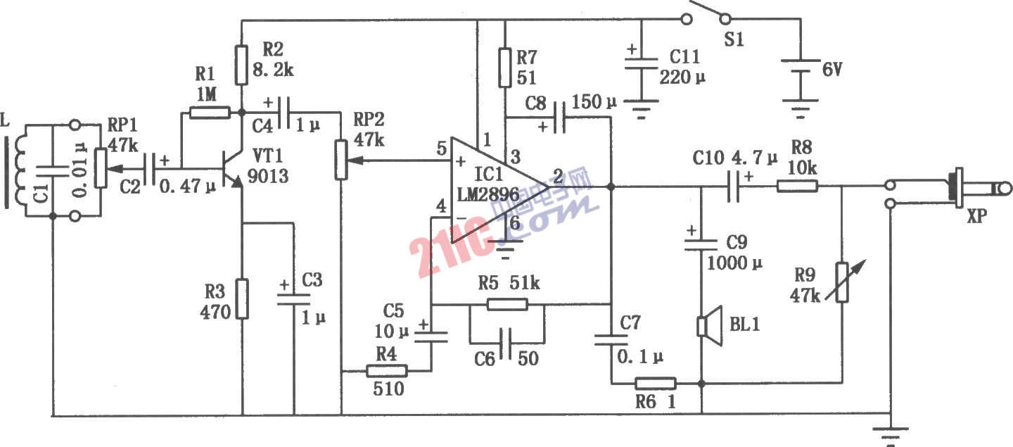 在一些場合(如召開電話會議)需要將電話里的聲音加以放大供多人收聽,不僅如此,有時還需要對電話里的內容進行錄音。本電路能同時滿足這兩種要求,制作時不需改動電話機,使用時只要放在電話機旁即可。當話音電流在電話機內線圈(耳機線圈或機內感應線圈)中通過時,在附近就存在著與話音電流變化規(guī)律完全一致的磁場,如果這時外加一個線圈L在其兩端就會感應出與磁場變化規(guī)律相同的信號電壓,然后再對該信號進行放大處理,就可以推動揚聲器供多人收聽。感應式電話機擴音器的電路如圖所示,圖中線圈L將電話機中話音泄漏磁場轉換成電信號后,通過電位器RP1的控制進入由三極管VT1組成的前置放大級,然后再通過電容C4和電位器RP2進入功率放大級,由IC1(音頻集成功放LM2896)進行功率放大,從IC1②腳輸出的信號推動揚聲器BL1發(fā)出聲音。當揚聲器阻抗為412時,IC1的輸出功率可達5W以上,在一間100m2的房間或會議室,可供幾十人收聽。為了能將電話內容進行錄音,IC1的輸出信號還有一部分通過電容C10耦合、電阻R8限流和R9分壓后,由插頭XP輸入到錄音機的線路輸入端進行實時錄音。