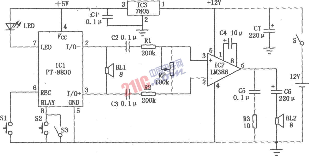 電子吆喝器電路如圖所示,它由語音錄放、音頻功率放大和穩(wěn)壓電源三部分電路組成。其中ICl 為“傻瓜”型語音錄放集成電路PT-8815/20/30,它能進行30秒鐘的語音錄入和播放;IC2為集成功率放大器LM386,用于放大ICl輸出的語音信號,使揚聲器獲得足夠功率而發(fā)出響亮的聲音;IC3采用7805型固定式三端集成穩(wěn)壓器。
