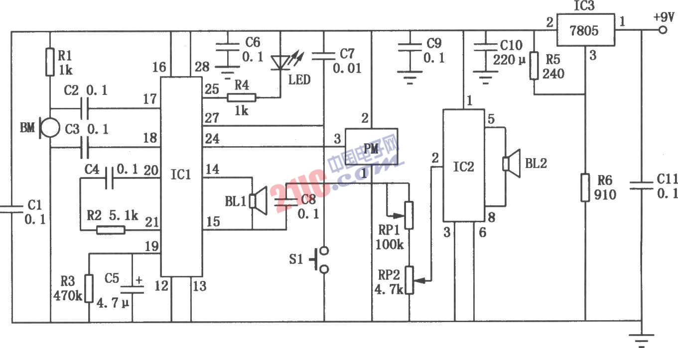如圖所示為電子看門狗電路。它具有普通狗看守家門的本領(lǐng)。每當(dāng)有人進(jìn)入大門內(nèi)10米監(jiān)視區(qū)域,它就會發(fā)出逼真的狗叫聲。這種叫聲能維持10秒鐘,如果此人不離開,電子看門狗便會一直叫下去。