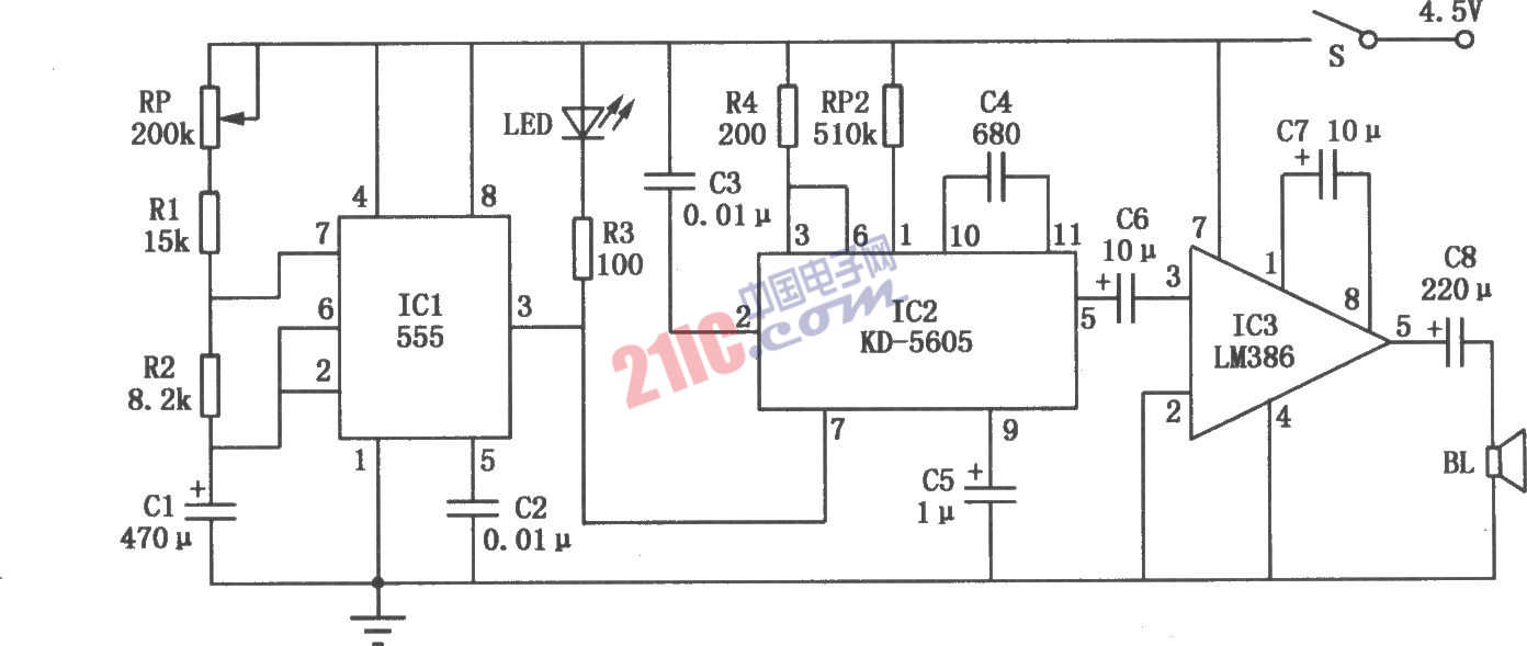 電子貓電路如圖所示。ICl為時基集成電路NE555,它與電位器RP、電阻Rl、R2和電容Cl組成時間控制電路,用來控制貓叫聲的間隔。IC2為貓叫聲集成電路KD-5605,它將貓的叫聲固化在電路內部。合上開關S,電源經RP、Rl、R2向Cl充電,Cl兩端電壓充到電源電壓2/3時,ICl的③腳輸出低電平,發(fā)光二極管LED通電發(fā)光,同時IC2得電工作,其輸出的貓叫信號經IC3功率放大后,推動揚聲器BL發(fā)出洪亮逼真的貓叫聲,達到驅鼠目的。與此同時,ICl內部放電管導通,Cl貯存電荷經R2向IC1⑦腳放電。當Cl兩端電壓降至電源電壓l/3時,ICl的③腳輸出高電平,LED熄滅,IC2也失電停止工作,貓叫聲停止。電源又通過RP、Rl、R2向C1充電,電路如此循環(huán)工作。