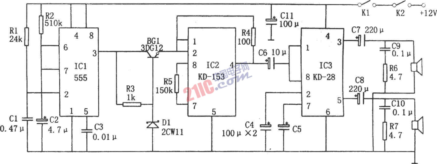 如圖所示為公共汽車關門自動通報電路。該電路由單穩(wěn)延時電路、叮咚聲集成電路KD-153、雙功率放大集成電路KD-28、音響電路(揚聲器)等組成。 單穩(wěn)延時電路由IC1(555)和R1、C1、R2、C2組成。在微動開關K1、K2合上瞬聞,C1上電壓不能突變,555因②腳為低電平(<1/3VDD)而發(fā)生置位,③腳輸出的高電平使BG1導通,相應KD-153得電工作,輸出的叮咚信號經KD-28放大后驅動2只揚聲器發(fā)聲。與此同時。C2進行充電,當C2充到使⑥腳電位達到2/3VDD時,555發(fā)生復位。相應揚聲器停止發(fā)聲。揚聲器發(fā)聲對應的這一段時間即單穩(wěn)電路的延時td=1.1R2C2,圖示參數對應約為3秒。改變充電時間常數R2C2,即可調節(jié)音響的時間。