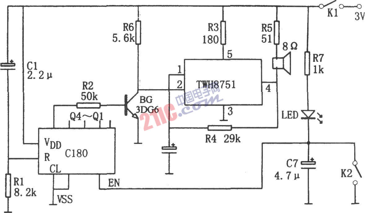 如圖所示為135卷片報(bào)位電路。該電路主要由計(jì)數(shù)器C180和TWH8751組成。其中TWH8751組成振蕩器,其振蕩頻率約為1kHz。 電路中計(jì)數(shù)開關(guān)K2由在135膠卷的小孔位置用環(huán)氧樹脂固定的黃銅接觸片所引出的一根導(dǎo)線與機(jī)體構(gòu)成,當(dāng)135卷片移動(dòng)時(shí),每跳過一個(gè)小方孔,則接觸片與機(jī)體接觸一次,產(chǎn)生一個(gè)計(jì)數(shù)信號(hào)。開機(jī)時(shí),因第一個(gè)小孔的接觸片與機(jī)體已接觸,C180被復(fù)位。當(dāng)一幅照片的第9個(gè)小孔到來時(shí)產(chǎn)生8個(gè)計(jì)數(shù)信號(hào),此時(shí)C180的Q4呈現(xiàn)高電平,使BG導(dǎo)通,振蕩器TWH8751因“ST’’(②腳)輸入低電乎而開始振蕩,由④腳輸出的信號(hào)驅(qū)動(dòng)喇叭發(fā)聲,告知主人照片到位。 電路在調(diào)試時(shí),先閉合計(jì)數(shù)開關(guān)K2,再閉合電源開關(guān)K1,使LED亮,Q1~Q4均為低電平。然后將K2打開再合上共八次,Q4為高電平,調(diào)整R2使BG導(dǎo)通,喇叭發(fā)聲,調(diào)節(jié)R4可改變發(fā)音的聲調(diào),調(diào)節(jié)R5可改變音量的大小。