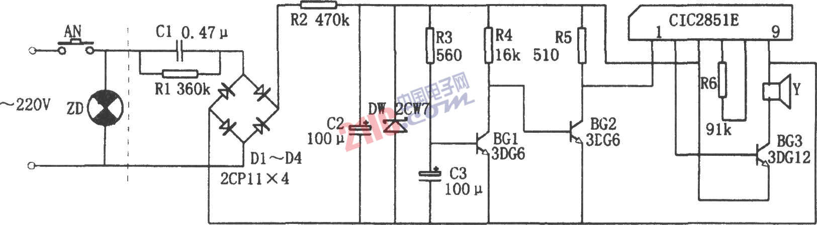 如圖所示為音樂型電冰箱關(guān)門提醒電路。該電路由降壓整流穩(wěn)壓電路、延時電路、音樂集成電路CIC2851E、揚聲器等組成。其中降壓整流穩(wěn)壓電路為整個電路提供3V左右的直流電壓。