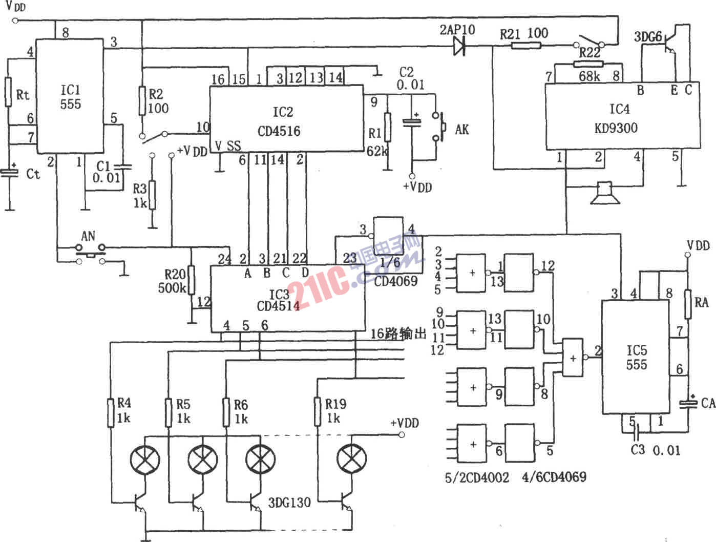 單穩(wěn)延時電路由555和Rt、Ct等組成,其延遲時間為td1=1.1RtCt。計數(shù)器IC2為可預置4位二進制數(shù)的可逆計數(shù)器CD4516。IC3為4位鎖存4-16線譯碼器。音響電路由音樂集成電路IC4(KD9300)和揚聲器等組成。