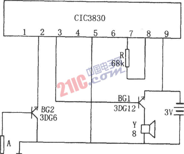 若水位淹沒探極A,則BG2導(dǎo)通,集成電路CIC3830因電源電路接通而開始工作,其發(fā)出的音樂信號經(jīng)BG1放大后推動揚聲器Y發(fā)聲,以提醒主人放水。當水位在探極A以下時,BG2截止,相應(yīng)CIC3830和揚聲器因電源電路不通而不工作,不發(fā)出音樂信號。