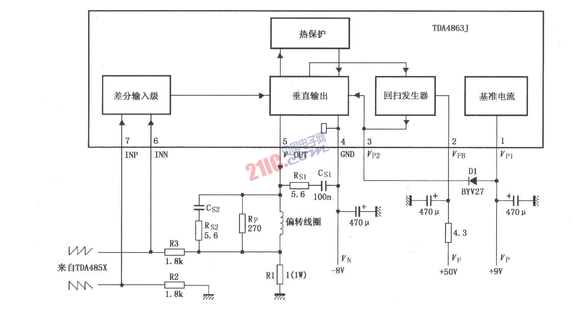 如圖所示為TDA4863J的基本應(yīng)用電路。當(dāng)正電源電壓VP、回掃電源電壓VF和負(fù)電源電壓VN加上時(shí)電路開始工作,輸入信號(hào)鋸齒波信號(hào)由6腳和7腳輸入到內(nèi)部差分輸入級(jí)的反相輸入端和同相輸入端,垂直輸出級(jí)將鋸齒波電壓放大后由5腳輸出。其中,垂直輸出級(jí)為準(zhǔn)互補(bǔ)推挽輸出放大器,對(duì)鋸齒波電壓進(jìn)行功率放大,鋸齒波電流通過(guò)偏轉(zhuǎn)線圈產(chǎn)生顯像所需的偏轉(zhuǎn)磁場(chǎng),控制電子束做線性掃描。在回掃期間,回掃發(fā)生器向垂直輸出級(jí)供電,使之在短的回掃時(shí)間內(nèi)具有最小功耗。垂直輸出級(jí)具有溫度保護(hù)限制,當(dāng)T1>150℃時(shí)開始降低垂直輸出級(jí)輸出電流以保護(hù)芯片,使之不至于過(guò)熱而損壞。Cs2的典型值為150nF,這時(shí)回掃時(shí)間和噪聲性能最佳。
