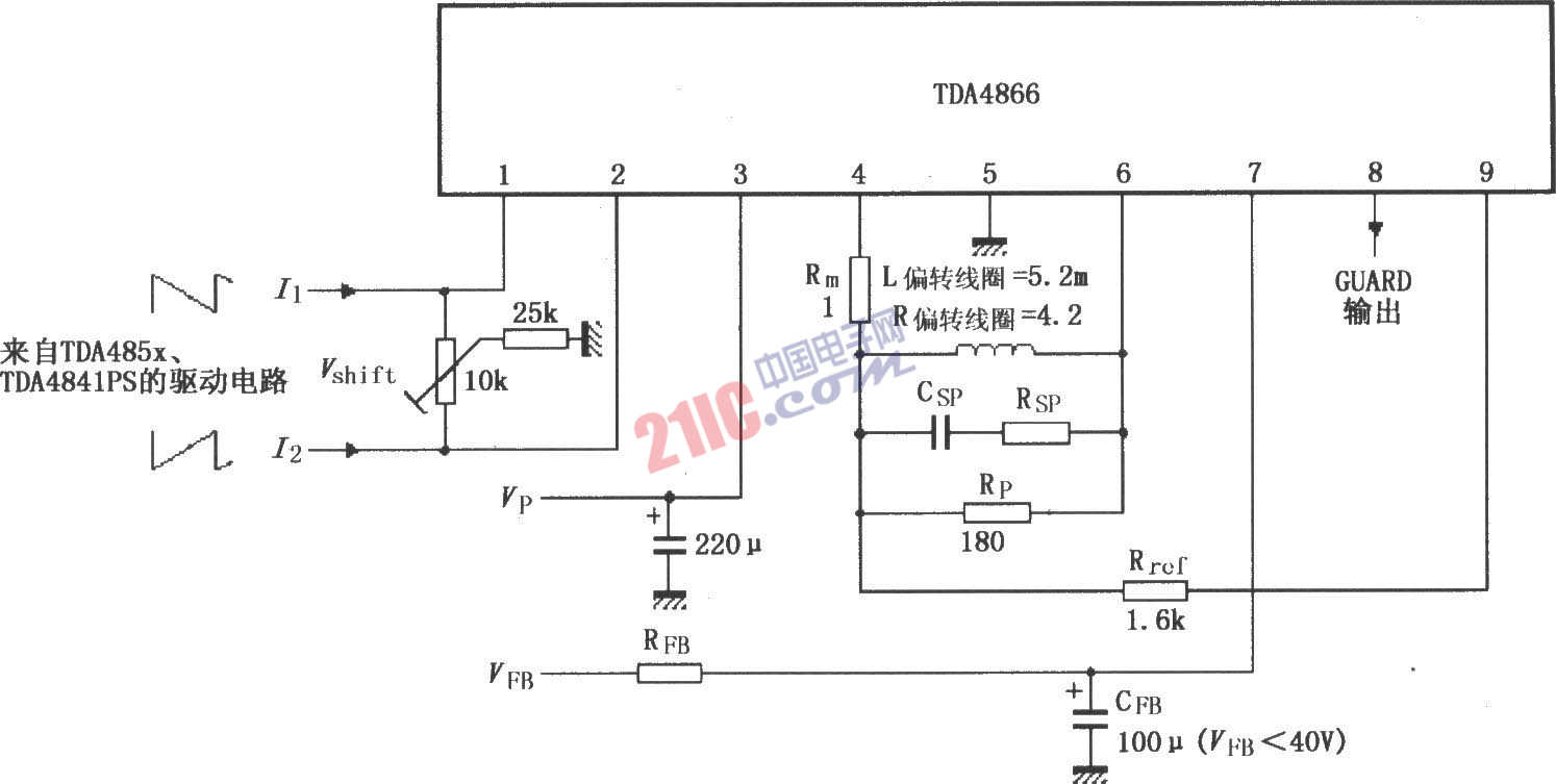 [導(dǎo)讀]如圖所示為由TDA4866構(gòu)成的對TDA485X、TDA484lPS信號的驅(qū)動(dòng)電路。當(dāng)正電源電壓VP、回掃電源電壓VFB加上時(shí)電路開始工作,來自PC監(jiān)控的I2C總線自動(dòng)同步偏移控制器TDA4841PS(或TDA485X)的輸入信號,由1腳和2腳輸入到內(nèi)部