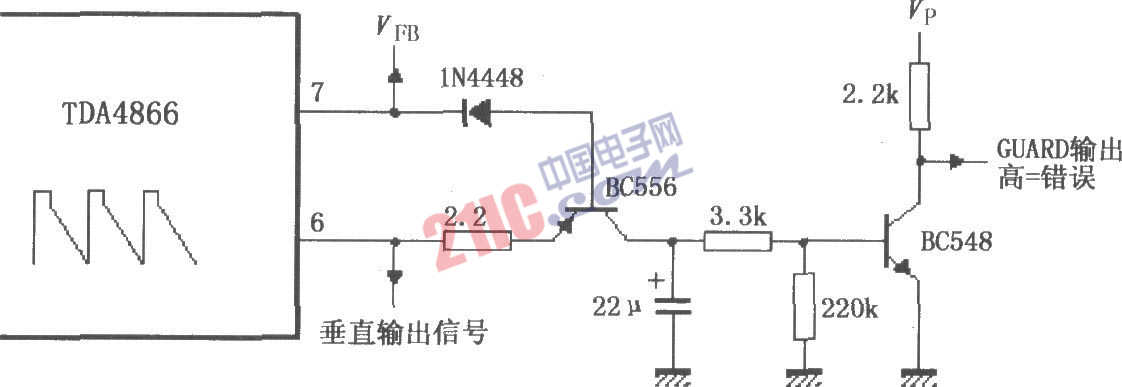 如圖所示為由TDA4866構(gòu)成的外部保護(hù)信號發(fā)生器電路。該電路的作用在于內(nèi)部防護(hù)失控時,外部保護(hù)電路起作用。正常工作時垂直輸出信號的幅度較大,三極管BC556導(dǎo)通,同時三極管BC548獲得基極電流也導(dǎo)通,輸出低電平作為正常工作指示。當(dāng)工作不正常時,垂直輸出信號幅度較低,三極管BC556截止,同時三極管BC548無基極電流也截止,輸出高電平作為錯誤工作指示。