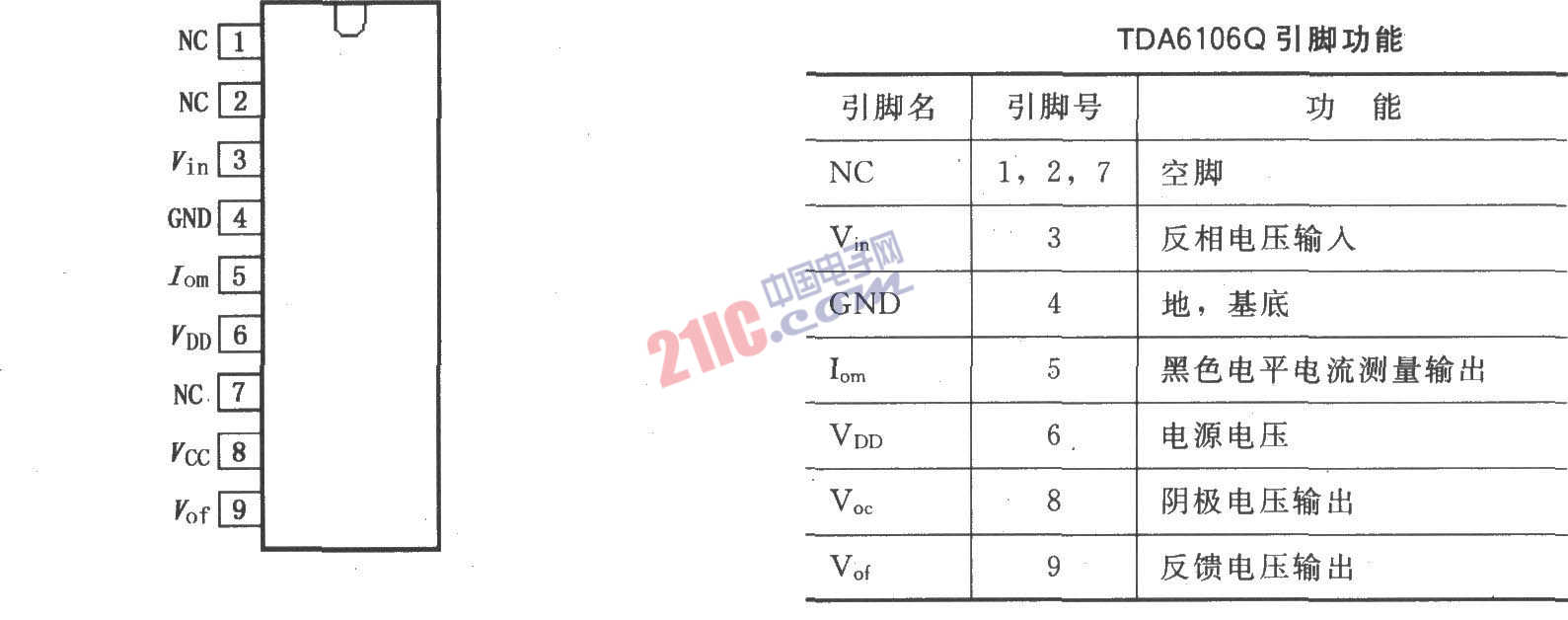 TDA6106Q是具有6MHz帶寬的視頻輸出放大器,9引腳塑料DIL-彎曲-SIL***率封裝。TDA6106Q采用高壓DMOS技術(shù),用于驅(qū)動(dòng)彩色CRT陰極,無(wú)需外部散熱器。該放大器采用黑色電平電流控制,以獲得最大使用性能,內(nèi)部保護(hù)電路可防止陰極射線管(CRT)出現(xiàn)正電壓放電跳火。TDA6106Q的引腳排列及功能如圖所示。