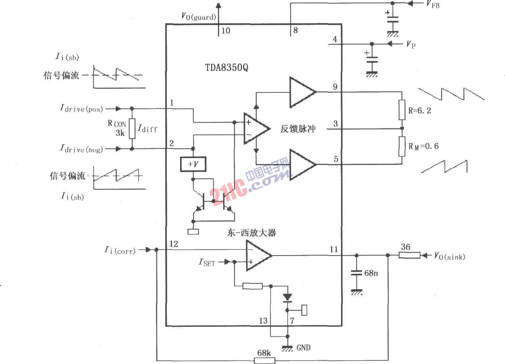 如圖所示為TDA8350Q的測(cè)試電路,該電路是在推挽功率放大器輸出端用電阻作為假負(fù)載替代偏轉(zhuǎn)線圈進(jìn)行測(cè)試。