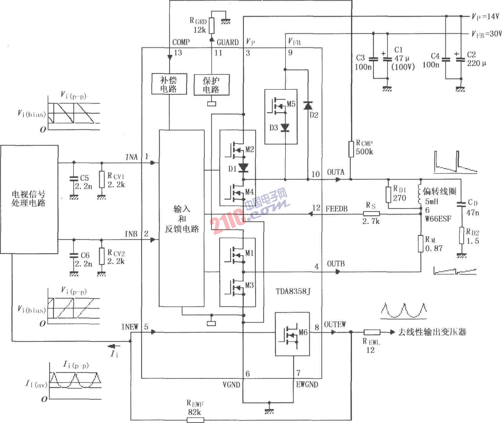 如圖所示為TDA8358J的實際應(yīng)用電路。電視信號處理電路輸山的信號分別輸入TDA8358J的1、2腳,正鋸齒波電壓輸入1腳,負鋸齒波電壓輸入2腳。信號在內(nèi)部經(jīng)過差分放大器及推挽功率放大器后,由10、4腳輸出加到偏轉(zhuǎn)線圈兩端。電阻RM與偏轉(zhuǎn)線圈串聯(lián),提供反饋電壓經(jīng)Rs由12腳輸入,使輸出的鋸齒波的線性得以改善,并且擴大鋸齒波的動態(tài)范同。調(diào)整電阻RM和RCV可改變輸出電流,輸出電流最大值不能超過3.2Ap-p。