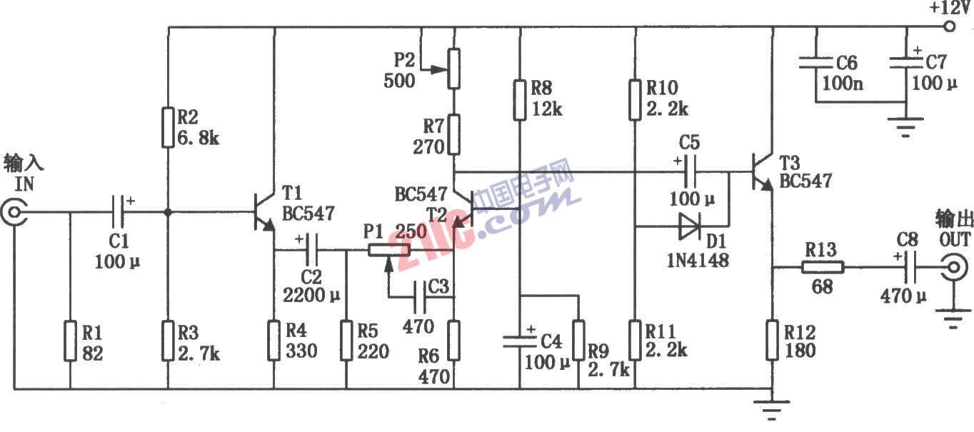 如圖所示的增強(qiáng)電路可以增加視頻信號的高頻分量,從而增強(qiáng)電視圖像的對比度,還可將它接到錄像機(jī)輸出端和電視機(jī)SCART輸入端之間。電路中的三極管Tl起緩沖作用。電阻Rl保證該增強(qiáng)電路的輸入阻抗約為75Ω。信號加到放大級T2上,其增益取決于電位器P2的位置。T2基極信號的頻率特性受Pl、R6、C6的制約,故而在一定程度上可由用戶控制(通過Pl)。緩沖級T3提供了足夠的電流,用于正確驅(qū)動(dòng)絕大多數(shù)75Ω的負(fù)載。調(diào)節(jié)電位器P2,使輸出為1Vp-p(對開路輸出,電平應(yīng)為2Vp-p)。