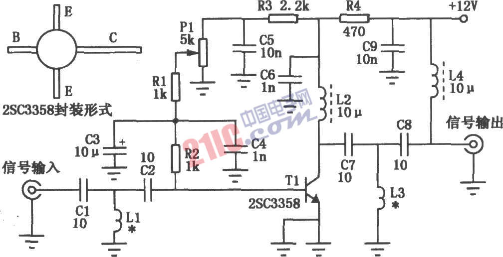 如圖所示是一個(gè)頻率范圍為400~850MHz的UHF放大電路。為了獲得最佳的性能和使用效果,電路所用的印刷電路應(yīng)經(jīng)鍍銀錫處理。