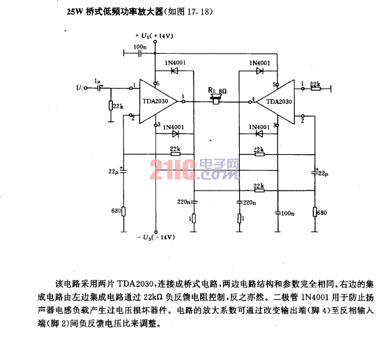 該電路前級(jí)為有強(qiáng)負(fù)反饋的共射極電路,后一級(jí)為射極跟隨器,從而使輸入阻抗為|Z1|=3.6兆歐,而輸出電阻僅為|Z2|=250歐。電路的工作頻率為20~20000Hz,在低至2.5V輸出電壓時(shí)