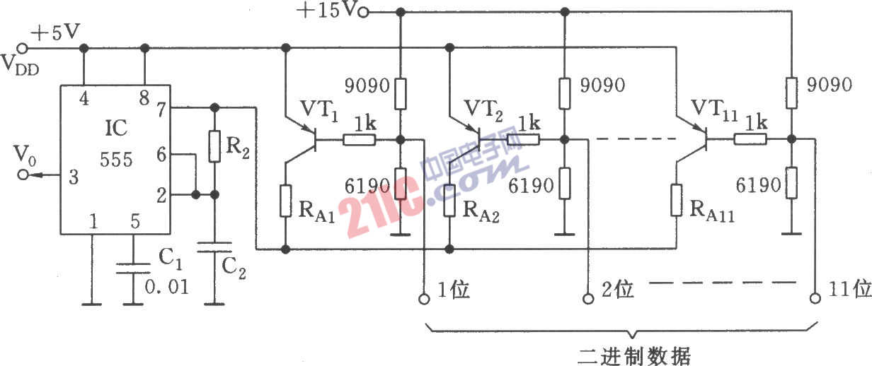 如圖所示,VT1~VT11的基極偏置電路加進(jìn)11位二進(jìn)制數(shù)據(jù)(高電平為“1”,低電平為“0”),有211=2048種組合。當(dāng)某一位為低電平時(shí),對(duì)應(yīng)的VT管導(dǎo)通,則C2通過RA+R2對(duì)其充電,RA為各導(dǎo)通管所接電阻的等效阻值,則振蕩頻率為