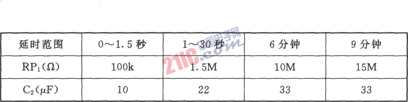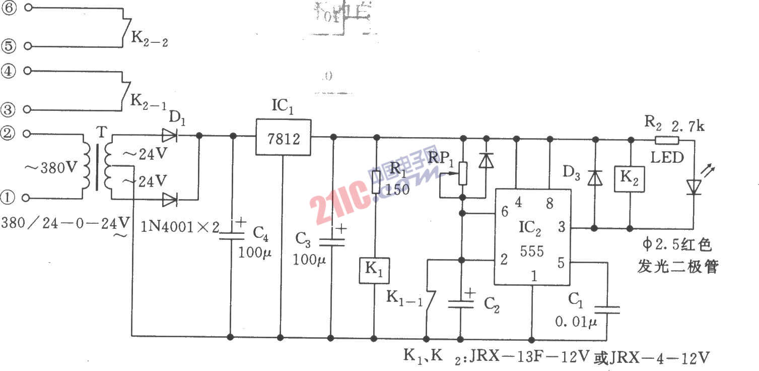 如圖所示,該時間繼電器是為替代JSK,系列晶體管時問繼電器設(shè)計的。電路包括降壓穩(wěn)壓源(+12V)、555單穩(wěn)電路和繼電控制等。555和RP1、C2組成單穩(wěn)延時電路,定時時間td =l.1RP1C2。剛接通電源時,2腳因呈低電位,使555置位,K2不動作,待C2通過RP1充電到2/3 VDD時,3腳轉(zhuǎn)呈低電平,K2吸合,將K2-1、K2-2:觸點接通。K1是為C2放電設(shè)置的。