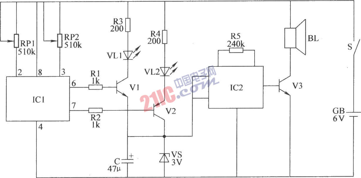 該雙限溫度報(bào)警器電路由溫度檢測(cè)控制電路、溫度指示電路和聲音報(bào)警電路組成,如圖所示。