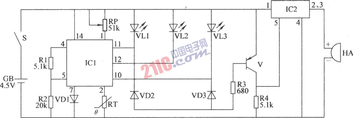 元器件選擇 R1~R4選用1/4W金屬膜電阻器或碳膜電阻器。 RP選用合成膜電阻器或可變電阻器。 RT選用負(fù)溫度系數(shù)熱敏電阻器。 VD1~VD3均選用IN4148型硅開關(guān)二極管。 VL1~VL3均選用φ3mm的發(fā)光二極管。 V選用S8550或3CG8550型硅PNP晶體管。 IC1選用ZH-3型測光專用集成電路;IC2選用TWH8778型電子開關(guān)集成電路。 HA選用內(nèi)置報警音源的直流電磁蜂鳴器。