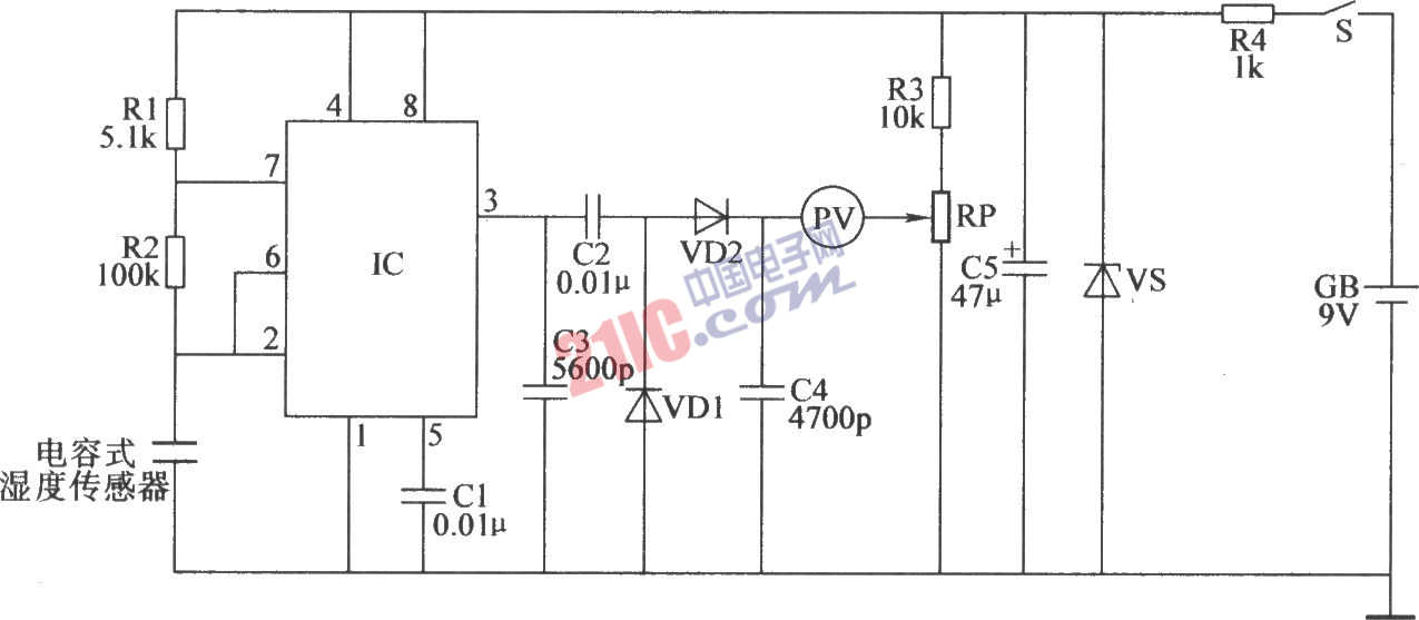 元器件選擇 R1~R3均選用1/4W碳膜電阻器;R4選用1/2W金屬膜電阻器。 RP選用合成膜電位器。 C1和C2選用滌綸電容器或獨(dú)石電容器;C3和C4均選用高頻瓷介電容器;C5選用耐壓值為l6V的鋁電解電容器。 VD1和VD2選用2AP9型鍺普通二極管或IN4148型硅開(kāi)關(guān)二極管。 VS選用2CW14或2CW55(1/4W、6~7.5V)型硅穩(wěn)壓二極管。 IC選用NE555或5G1555型時(shí)基集成電路。 S選用動(dòng)合按鈕。 GB選用9V疊層電池。 PV選用0~2.5V的直流電壓表。