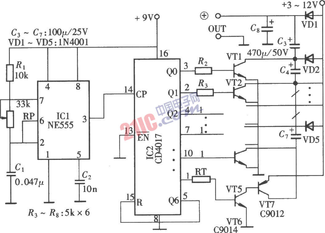 電子式倍壓、升壓電路在某些便攜式電子儀器中有著獨特的優(yōu)點,這是由于它省去了通常升壓電路中所用的升壓變壓器,用集成電路和電容器取而代之。這就可減輕儀器的重量,也可提高電源的變換效率,電路組成如圖所示。該電路由脈沖振蕩器、脈沖分配器、晶體管開關電路、儲能電容器和隔離二極管組成。