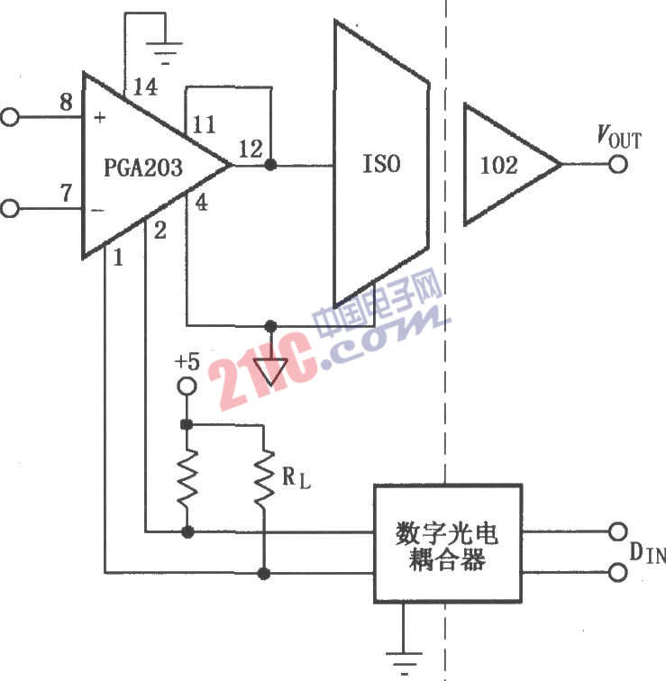 如圖所示為由PGA203與隔離放大器IS0102構(gòu)成的隔離式可編程增益儀表放大器電路。輸入信號(hào)由PGA203放大后再輸入IS0102,由IS0102隔離放大后輸出VOUT。這期間DIN經(jīng)過數(shù)字光電耦合器隔離,對(duì)PGA203的增益進(jìn)行選擇,RL為上拉電阻。