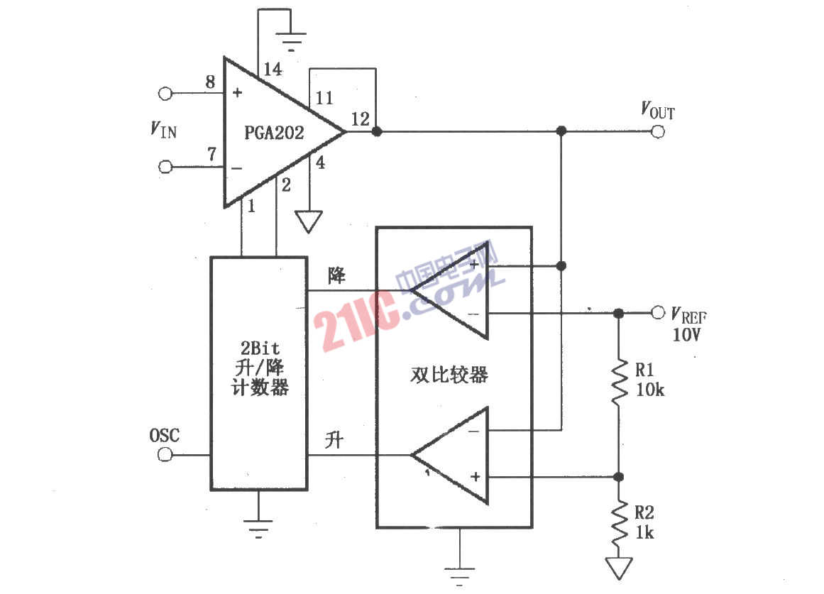 如圖所示為由PGA202與比較器、計數(shù)器構(gòu)成的自動量程切換電路。該電路采用比較器在輸出端與VOUT 進行比較,當VOUT >VREF=10V時,比較器輸出“降”信號,升/降計數(shù)器輸出2Bit編碼PGA202的A0、A1端,使PGA202的增益下降;當VOUT <[1kΩ/(1kΩ+10kΩ)]×10V=0.909V時,比較器輸出“升”信號,升/降計數(shù)器輸出2Bit編碼到PGA202的A0、A1端,使PGA202的增益增大;當0.909V<VOUT<10V時,增益保持不變。