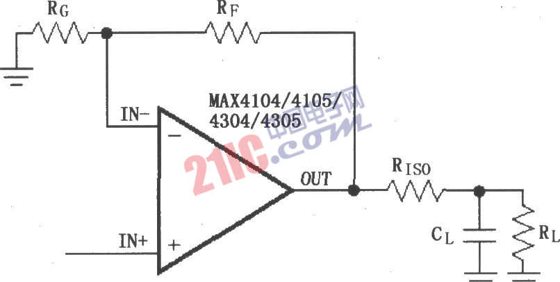 如圖所示為由MAX4104/4105/4304/4305采用隔離電阻RISO構(gòu)成的驅(qū)動電容性負(fù)載電路。MAX4104/4105/4304/4305的最大允許電容性負(fù)載分別為10pF,超過就有可能出現(xiàn)過沖振鈴和振蕩。該電路在輸出端與負(fù)載之間加了一個隔離電阻RISO,用于抑制過沖振鈴和振蕩。