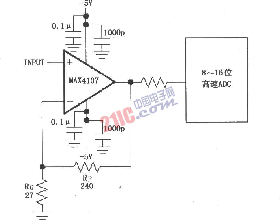如圖所示由MAX4107構(gòu)成的同相增益電路作為ADC輸入緩沖器。放大器增益由RF與RG的比值確定,圖中電阻設(shè)定增益約為10。