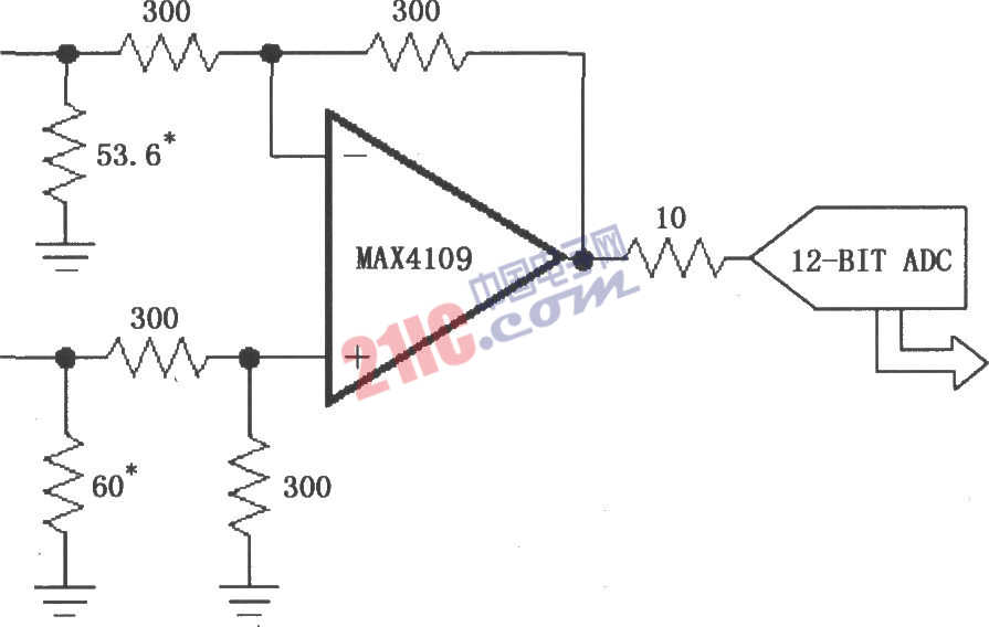 如圖所示為由MAX4109構(gòu)成的同相增益放大電路,作為ADC輸入緩沖器。*表示用于匹配50Ω信號源阻抗。